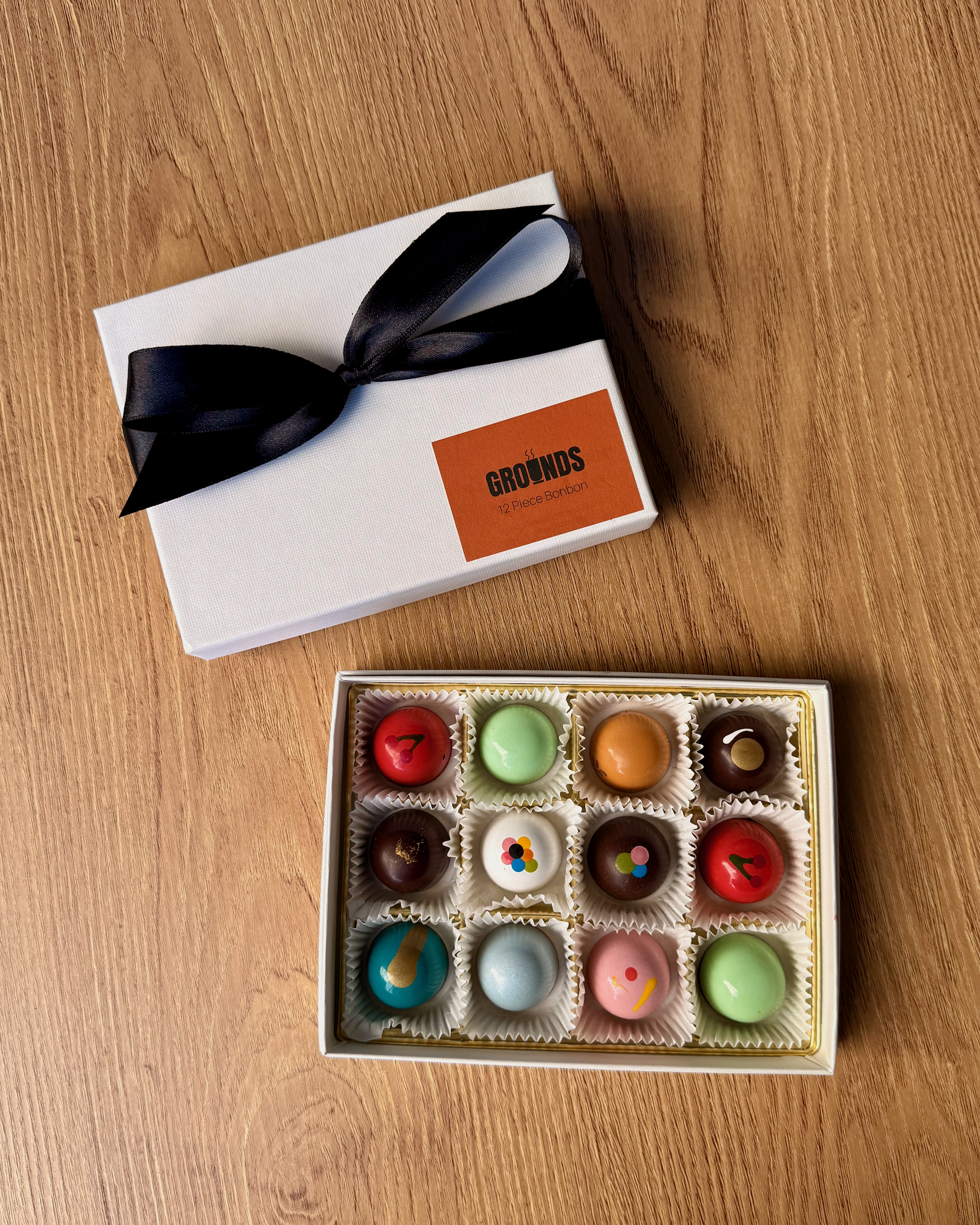 Design your ultimate chocolate indulgence! Choose 12 handcrafted bonbons from Grounds' flavor collection and create a luxurious gift or personal treat.